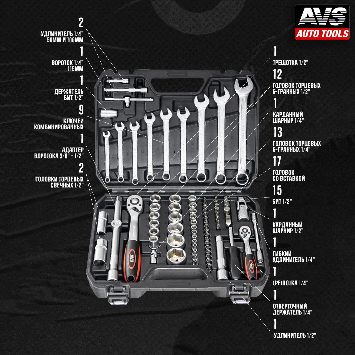 Универсальный набор инструментов для автомобиля AVS ATS-82, 82 предмета для ремонта, для дома (Профессиональный инструмент), A07823S информация: