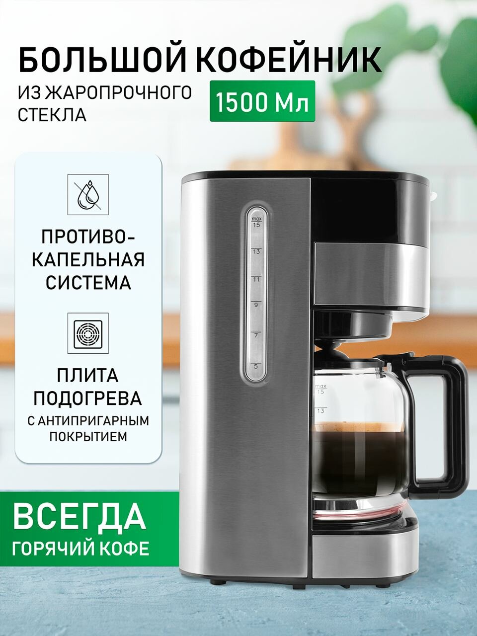 Кофеварка Centek CT-1145 капельная 900Вт, 1500мл, 3 ур. крепости, LED, капля стоп, подогрев