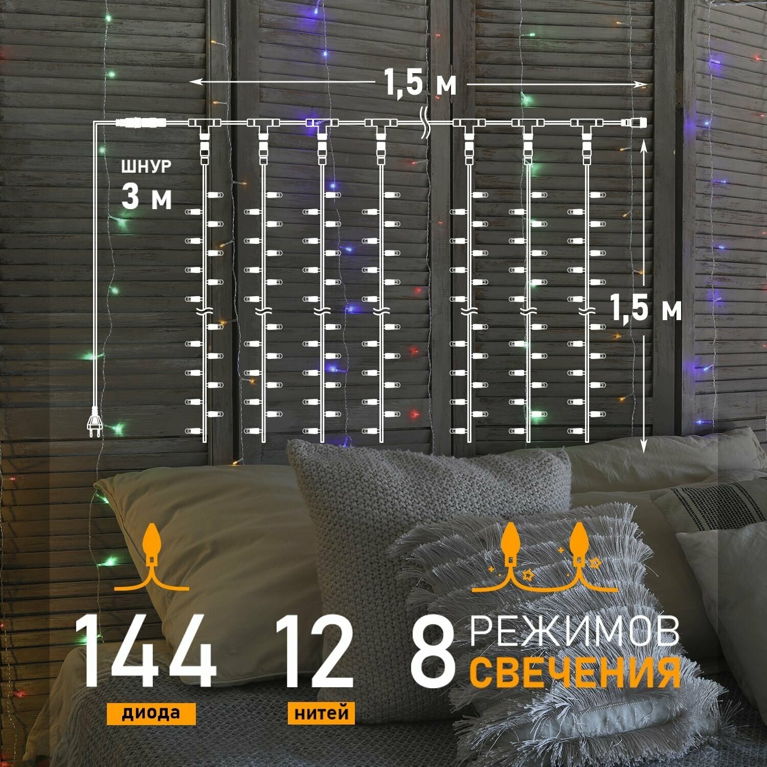 Гирлянда электрогирлянда новогодняя светодиодная 144 LED Neon-Night Дождь-занавес 1.5х1.5м с контроллером и насадками, мультиколор