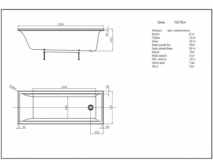 Ванна Gamma 140х70 см, акриловая, на каркасе, экран к ванне Gamma 140