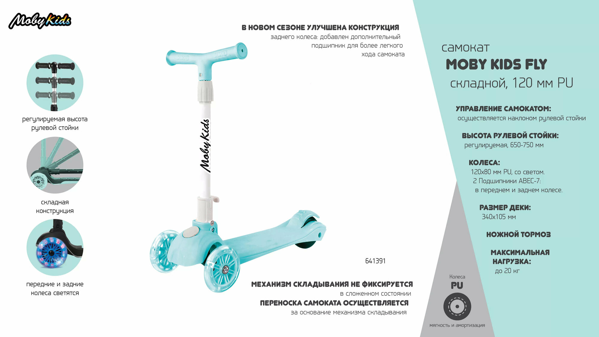 Трехколесный складной самокат Moby Kids Fly 120 PU со светом мятный 641391 2 611 ₽