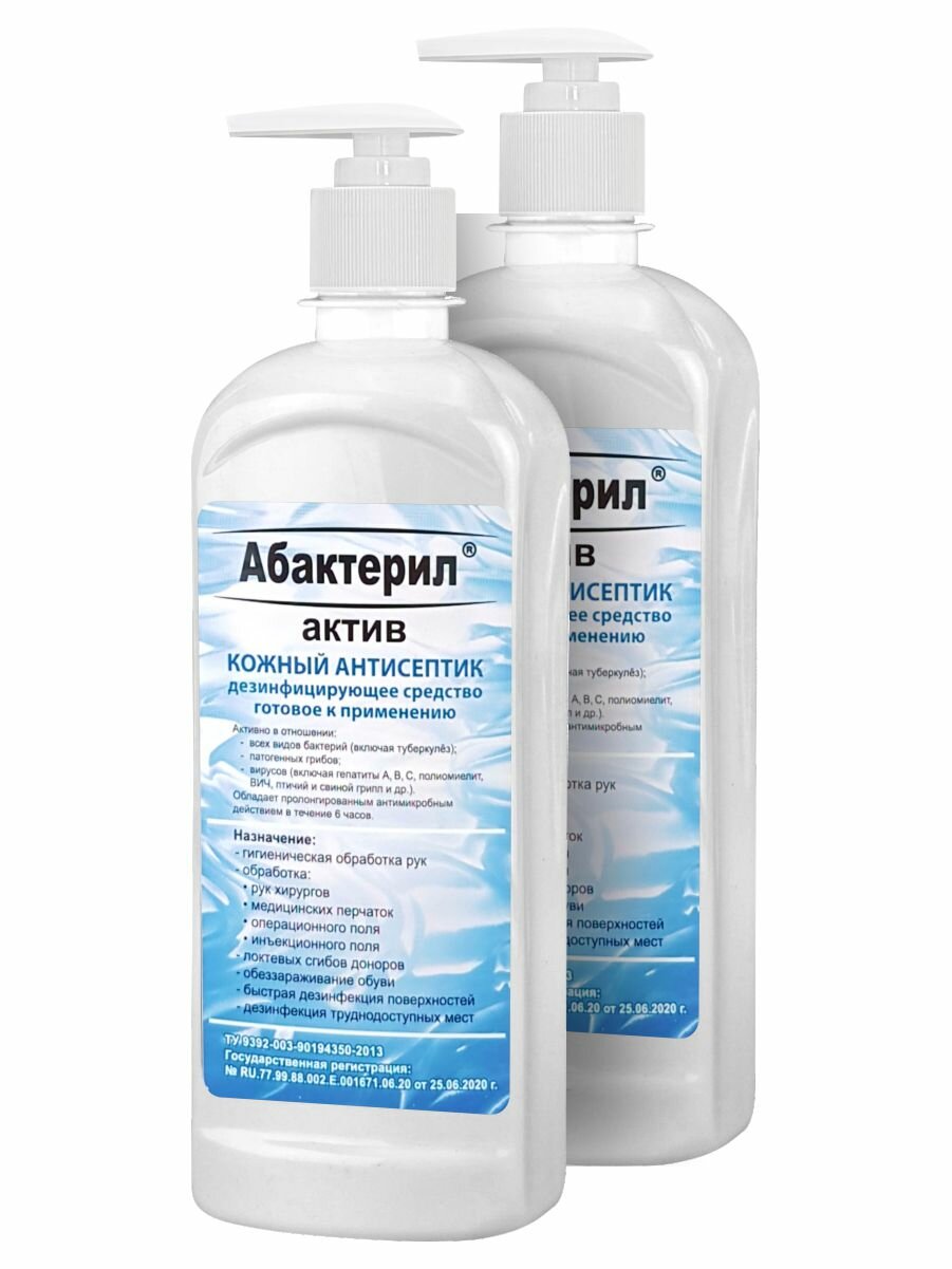 2 шт. Кожный антисептик с вирулицидной активностью ГОСТ 12.1.007-76 Абактерил-Актив с насос-дозатором 1 л.