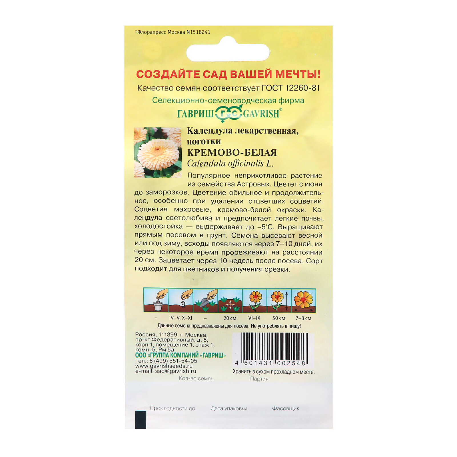 Семена Гавриш Календула Кремово-белая 0,3 г информация: