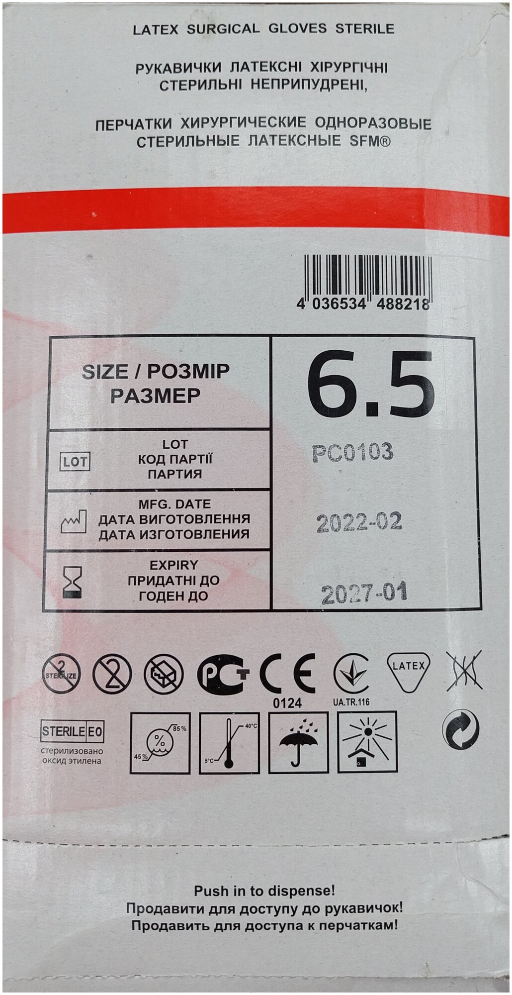 Перчатки латексные стерильные хирургические SFM, цвет: бежевый, размер 6.5, 2 шт. (1 пара), с валиком, неопудренные