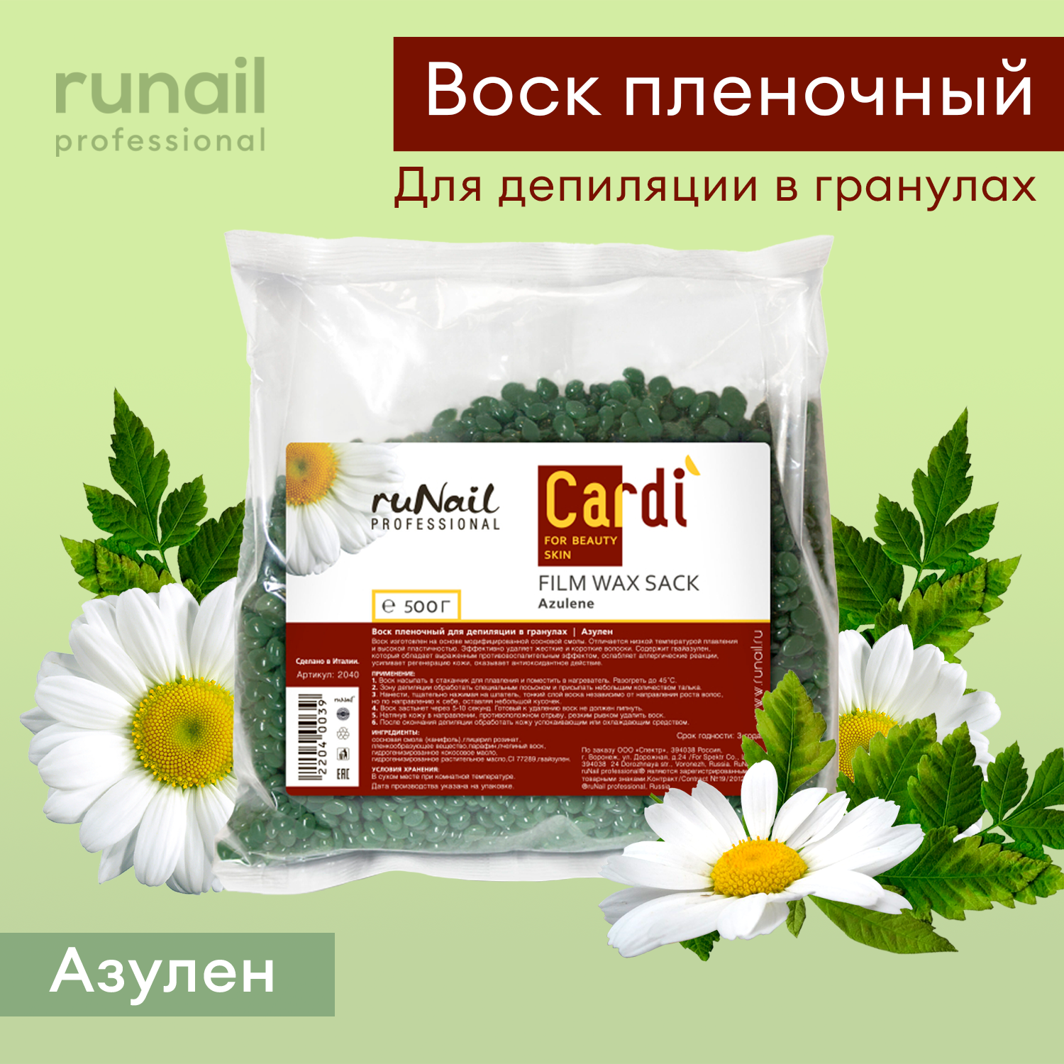 ruNail, Воск пленочный для депиляции в гранулах Cardi (аромат: "Азулен"), 500 г №2040