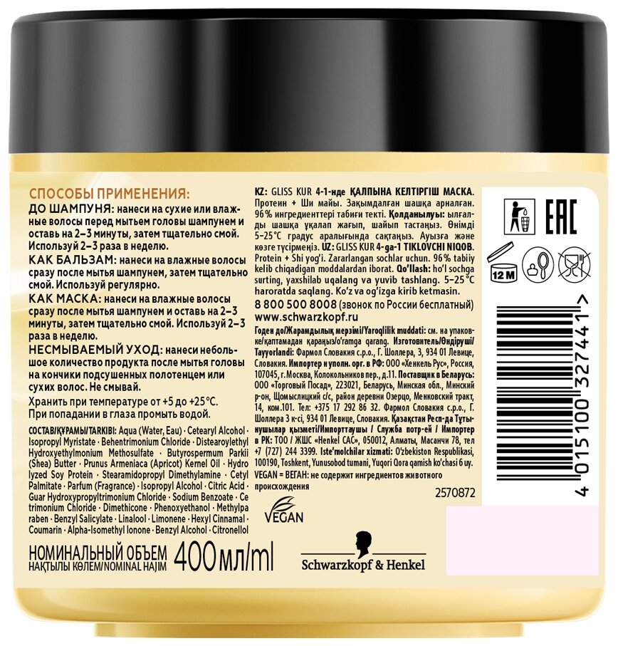 Маска для волос GLISS KUR 4в1, восстанавливающая, 400 мл информация: