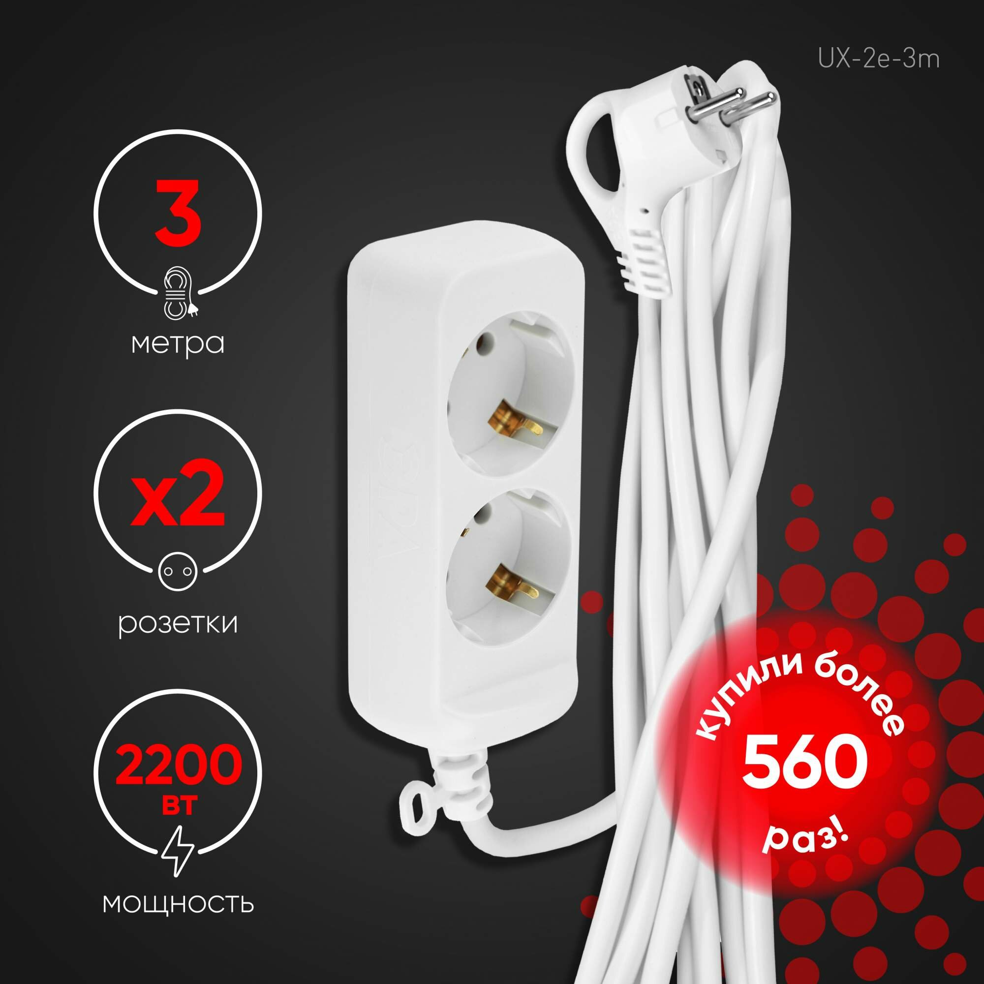 Удлинитель электрический ЭРА UX-2e-3m с заземлением 2 розетки 3м ПВС 3x0,75мм² 10А арт. Б0038573 (1 шт.)