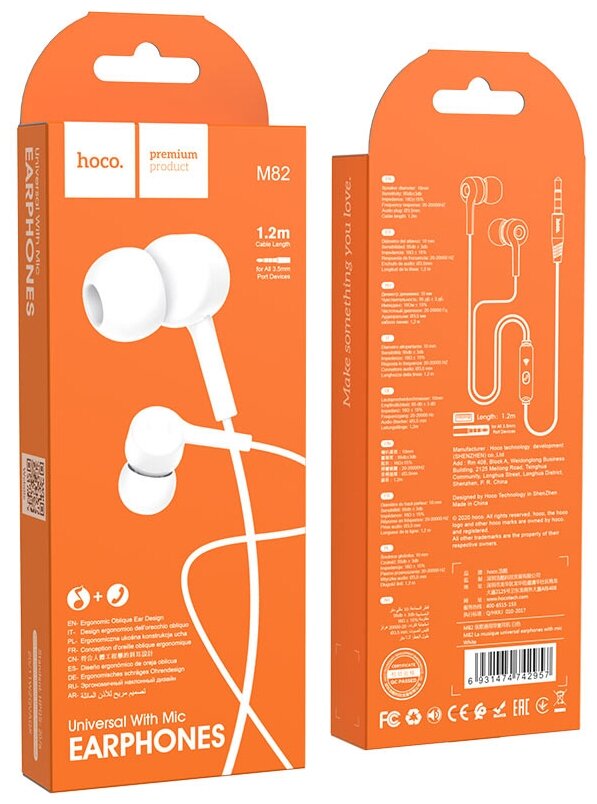 Наушники Hoco M82, проводные, вакуумные, микрофон, Jack 3.5 мм, 1.2 м, белые