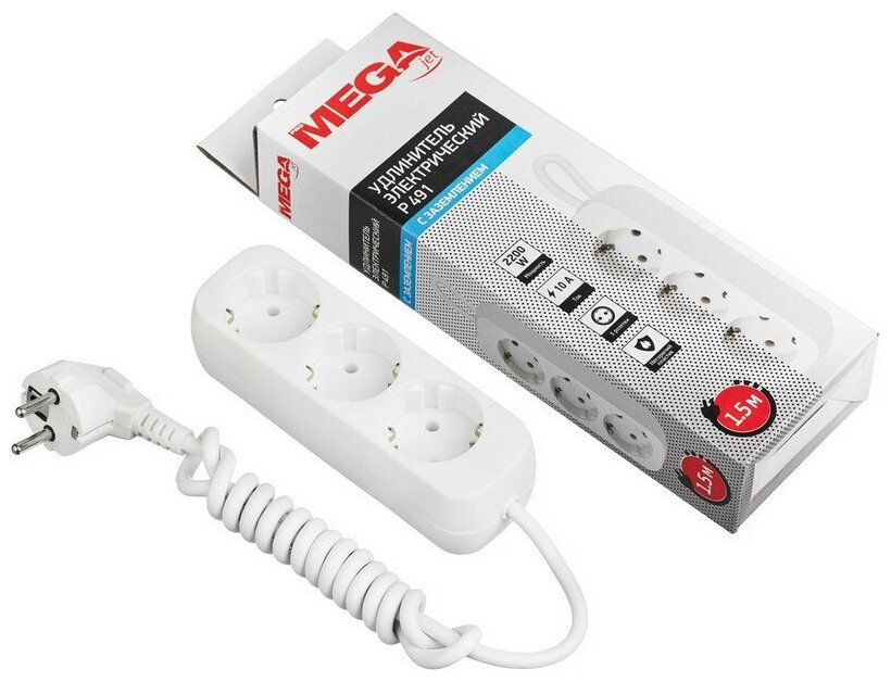 Удлинитель ProMEGA jet р491, 3 розетки, с/з, 10А / 2200 Вт белый 1.5 м информация: