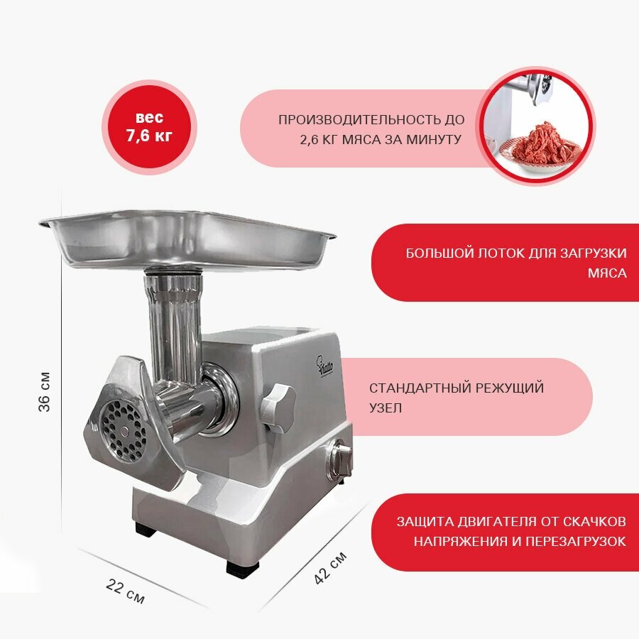 Мясорубка MI-07-G091/мощность 2000 Вт/медный двигатель/низкий уровень шума/реверс/3 диска 3,5,7 мм/алюминиевая форма