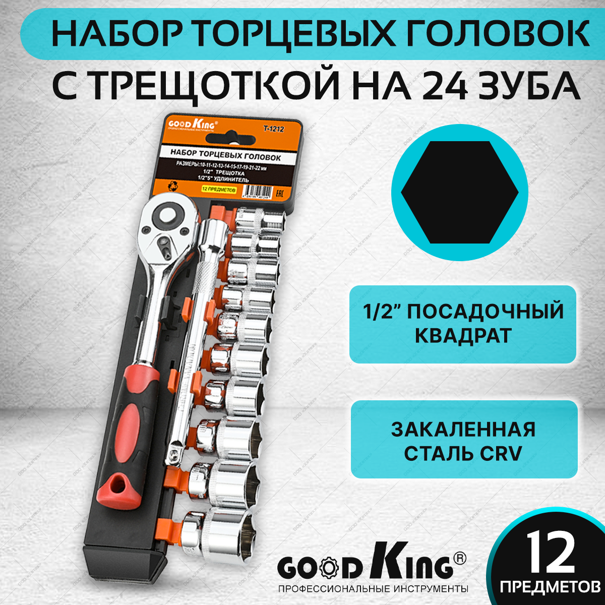 Набор торцевых головок Goodking GOOKING T-1212, 12 предметов с трещоткой 1/2 дюйма и удлинителем информация: