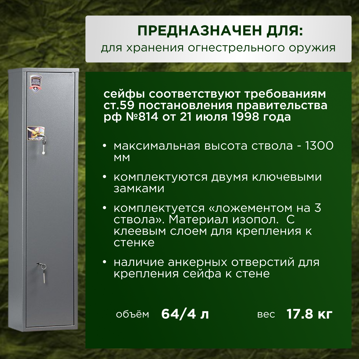 Сейф оружейный "Чирок 1320" на 3 ствола, Максимальная высота ствола - 1300 мм, Ключевой замок, 1330x300x200 мм