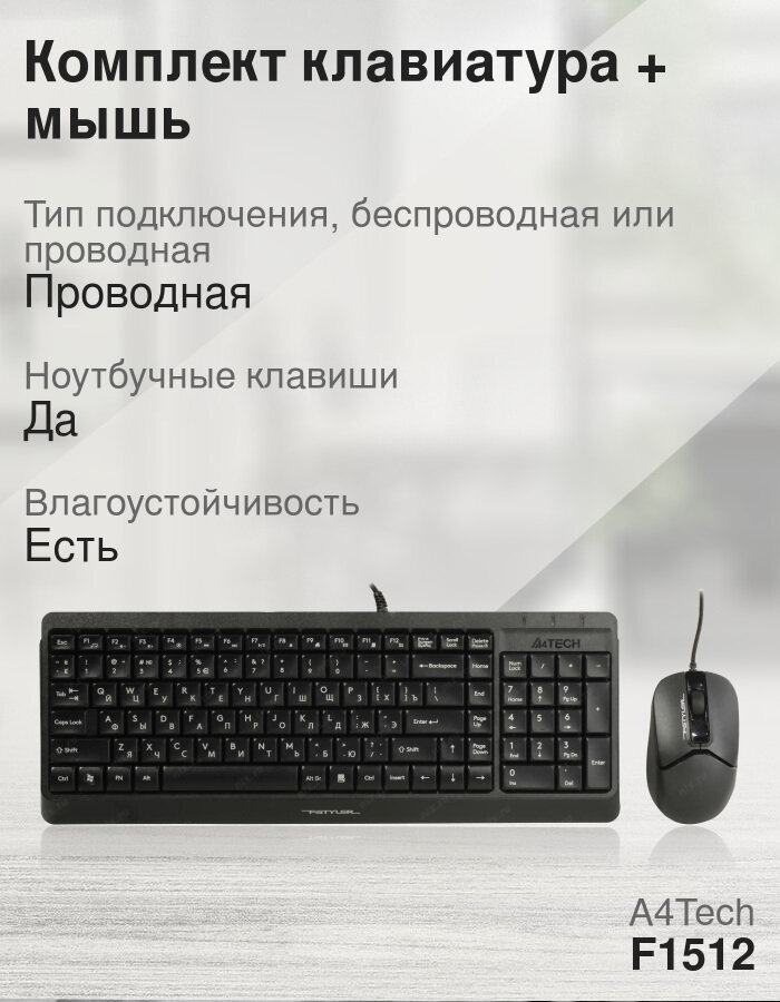 Клавиатура + мышь A4Tech Fstyler F1512 клавиатура черная, мышь черная, USB информация: