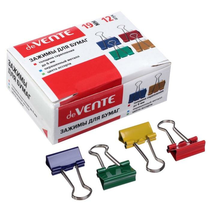 10 цен на Зажимы для бумаг 19 мм, 12 штук, deVENTE, металлические, микс х 4 цвета, картонная коробка