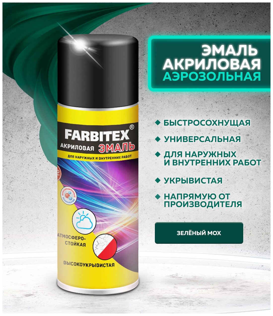 Эмаль акриловая аэрозоль FARBITEX (Артикул: 4100008937; Цвет: Зеленый мох RAL 6005; Фасовка = 0,52 л) информация: