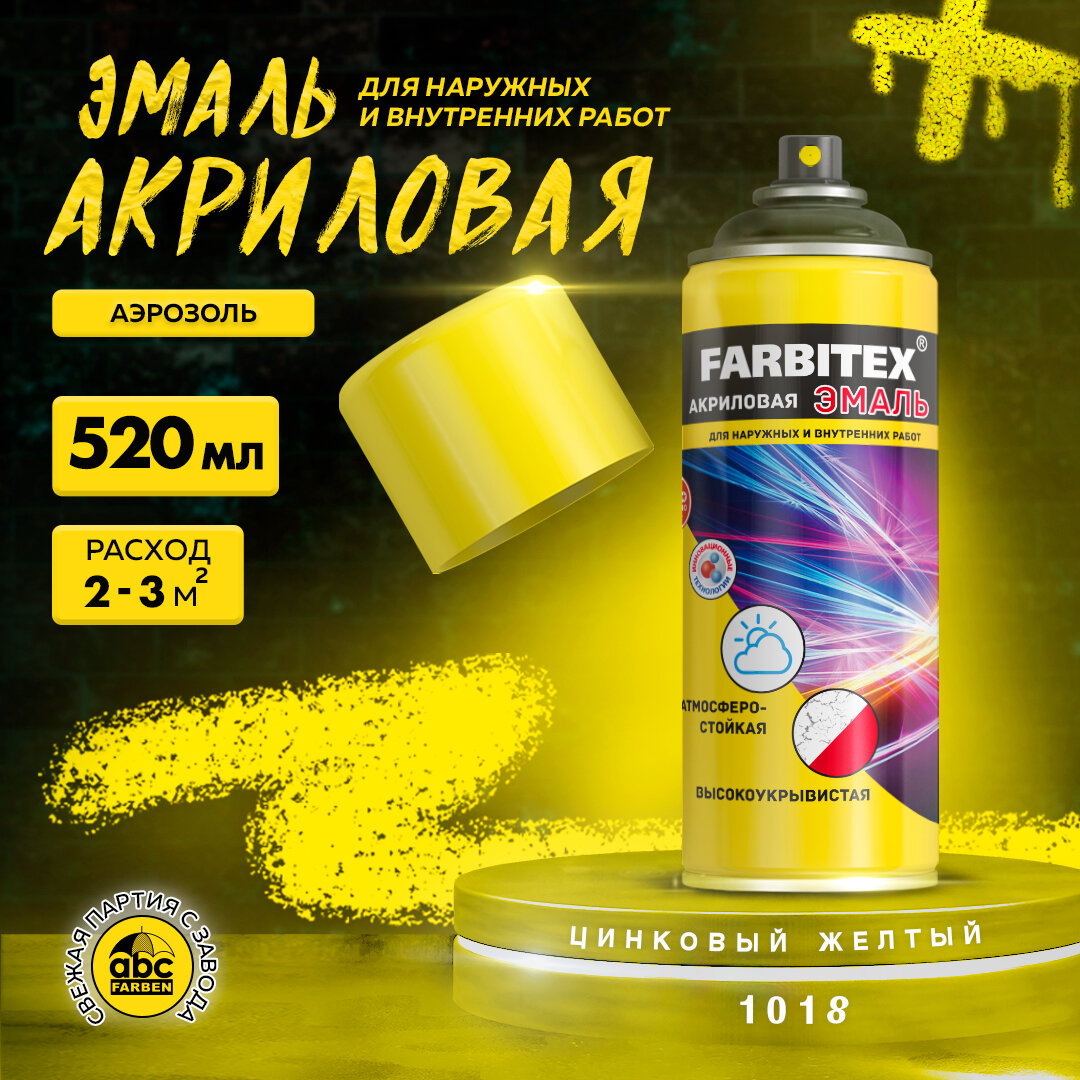 10 цен на Эмаль акриловая аэрозоль FARBITEX (Артикул: 4100008928; Цвет: Цинковый желтый RAL 1018; Фасовка = 0,52 л)
