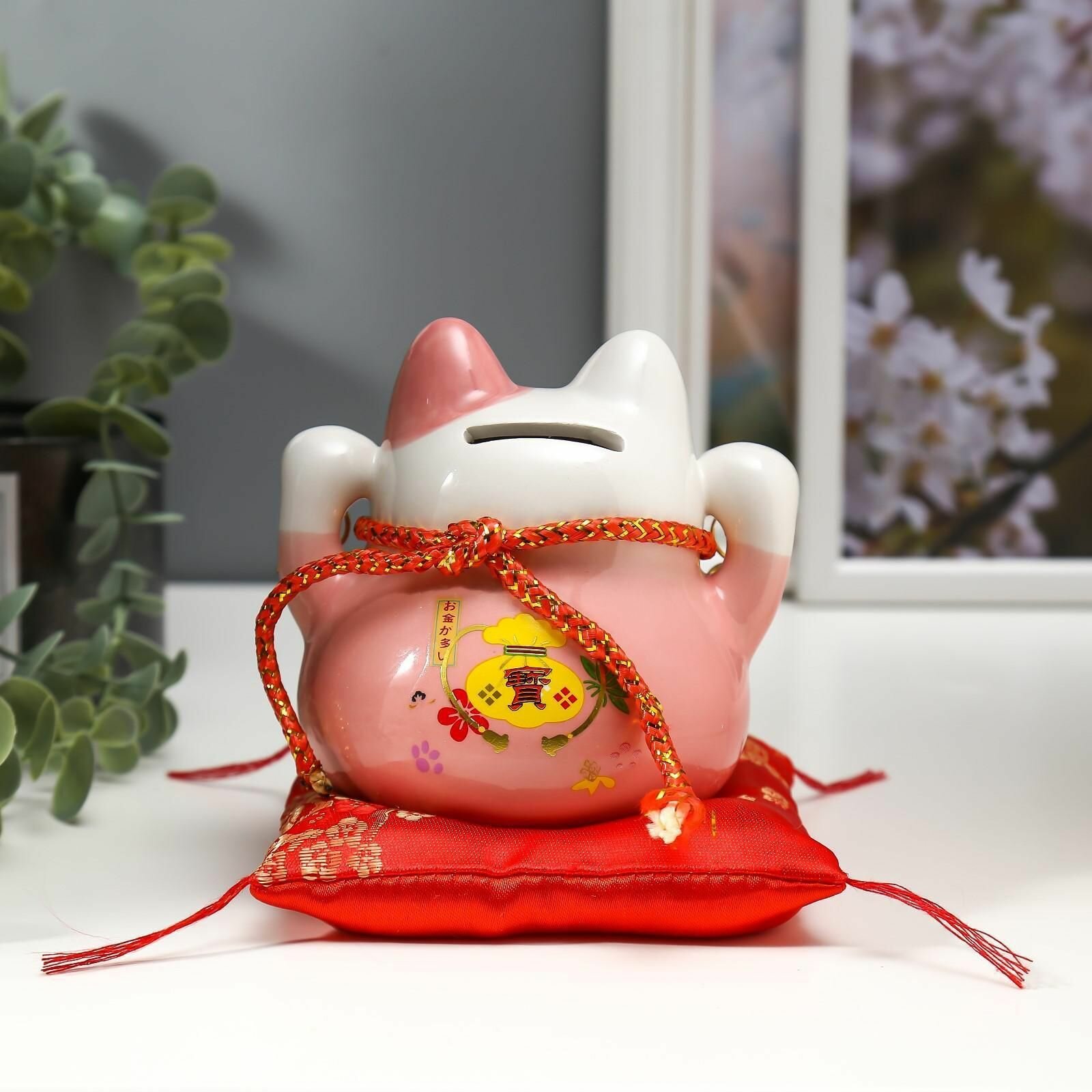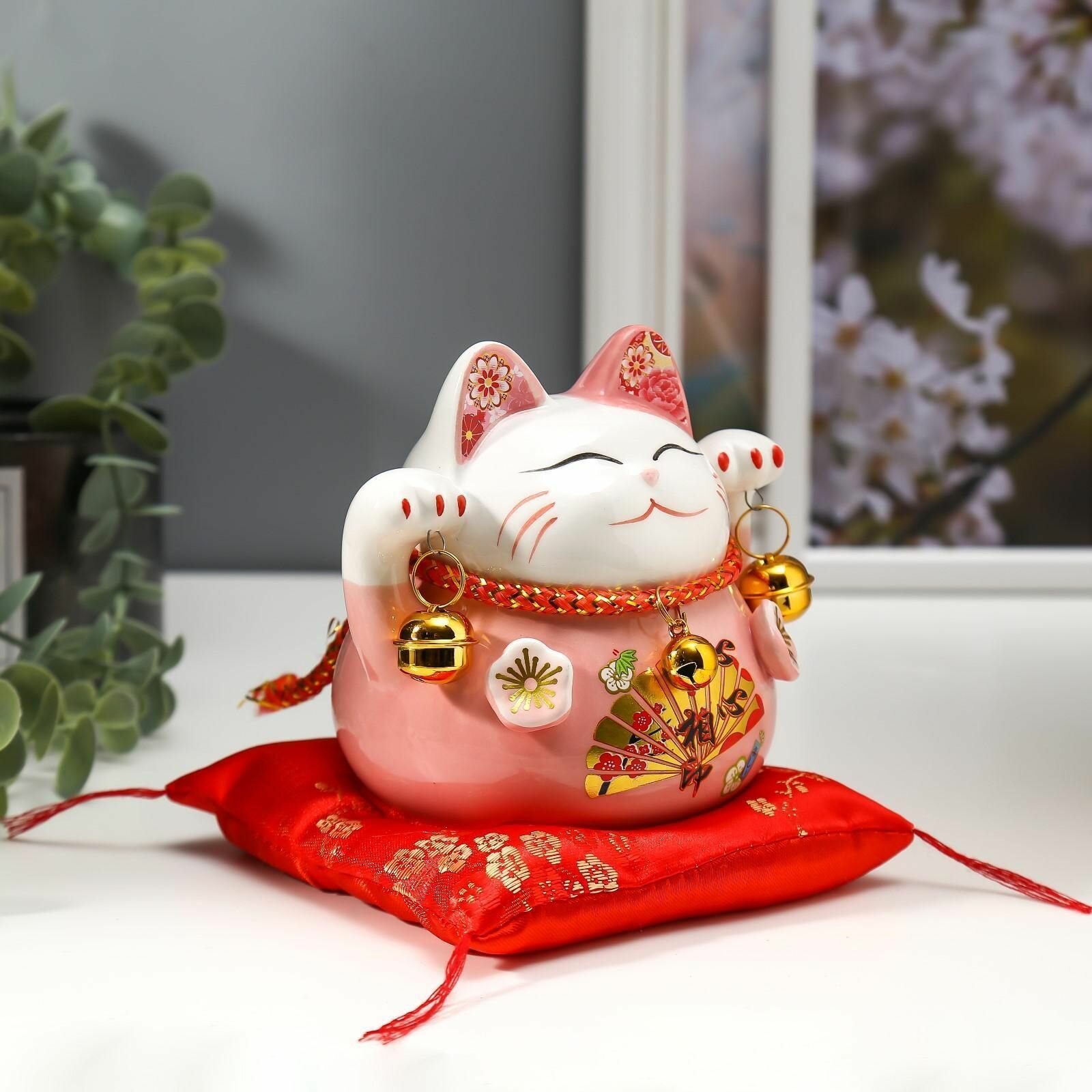 Сувенир керамика копилка "Розовый кот Манэки-нэко с колокольчиками" 11,5х11,5х9,5 см информация: