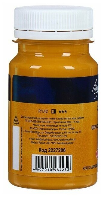 Завод художественных красок «Невская палитра» Краска акриловая художественная в банке 100 мл, ЗХК "Ладога", охра золотистая, 2227205