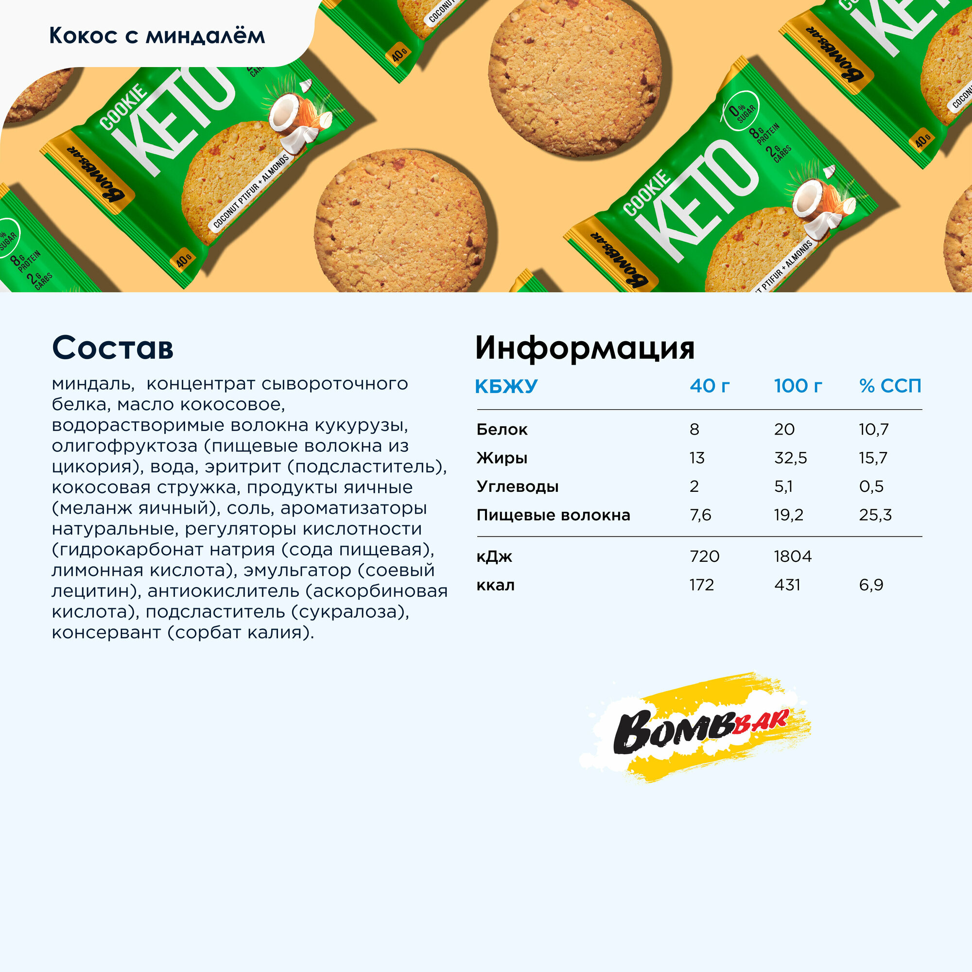 Кето Протеиновое печенье Bombbar без сахара "Кокос - Миндаль", 12шт х 40г информация: