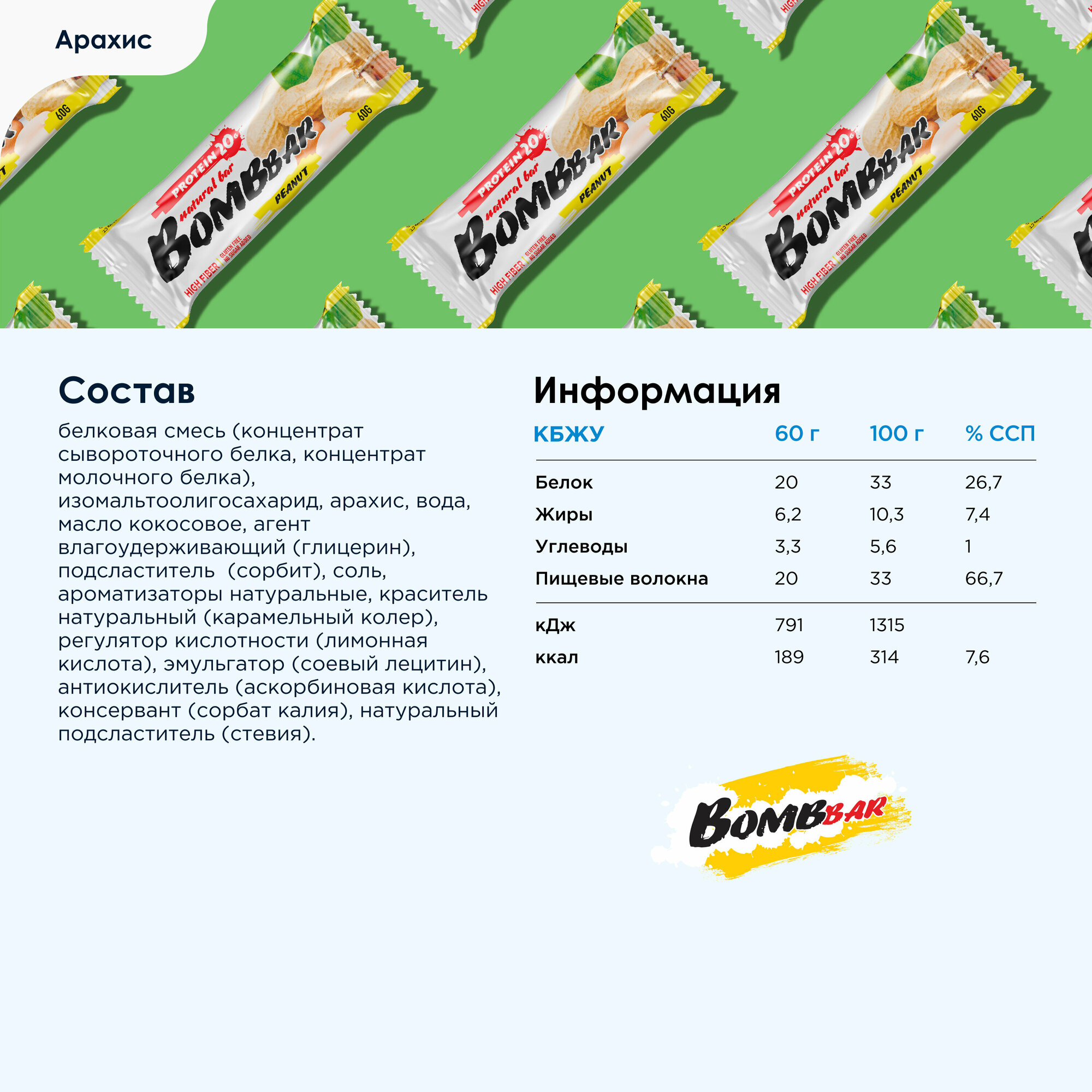 Bombbar Протеиновые батончики без сахара Арахис, 12шт х 60г информация: