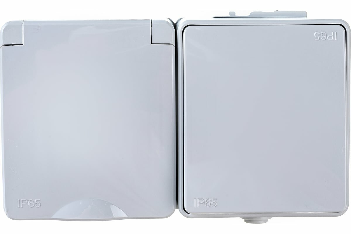 | Дополнительная информация | Блок 1-клавишный выключатель и розетка ЭРА Эксперт IP54 вертикальный с/з серый |