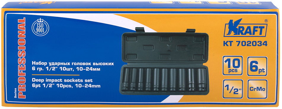 Набор ударных глубоких торцевых головок (10 шт; 10-24 мм; 1/2) KRAFT KT 702034