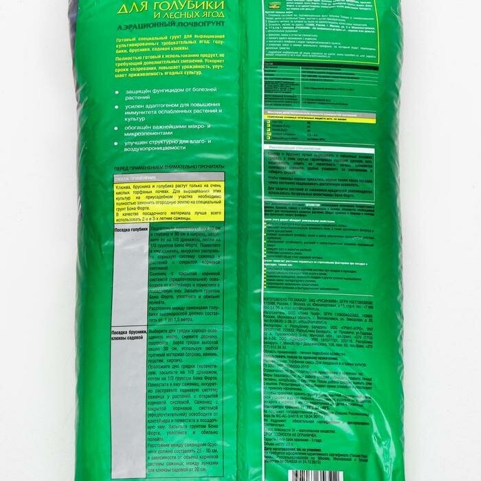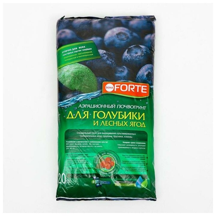 | Состав | Аэрационный почвогрунт для голубики и лесных ягод Bona Forte, 20 л |