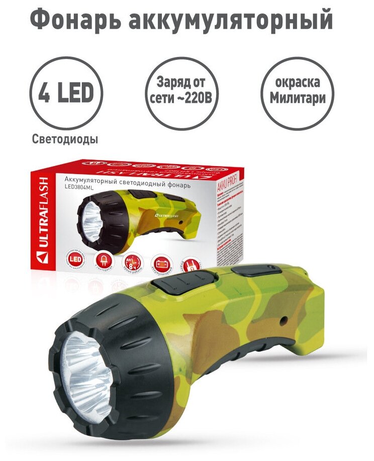Ultraflash Фонари LED3804ML фонарь аккум 220В, милитари, 4 LED, SLA, пластик, коробка 423 ₽