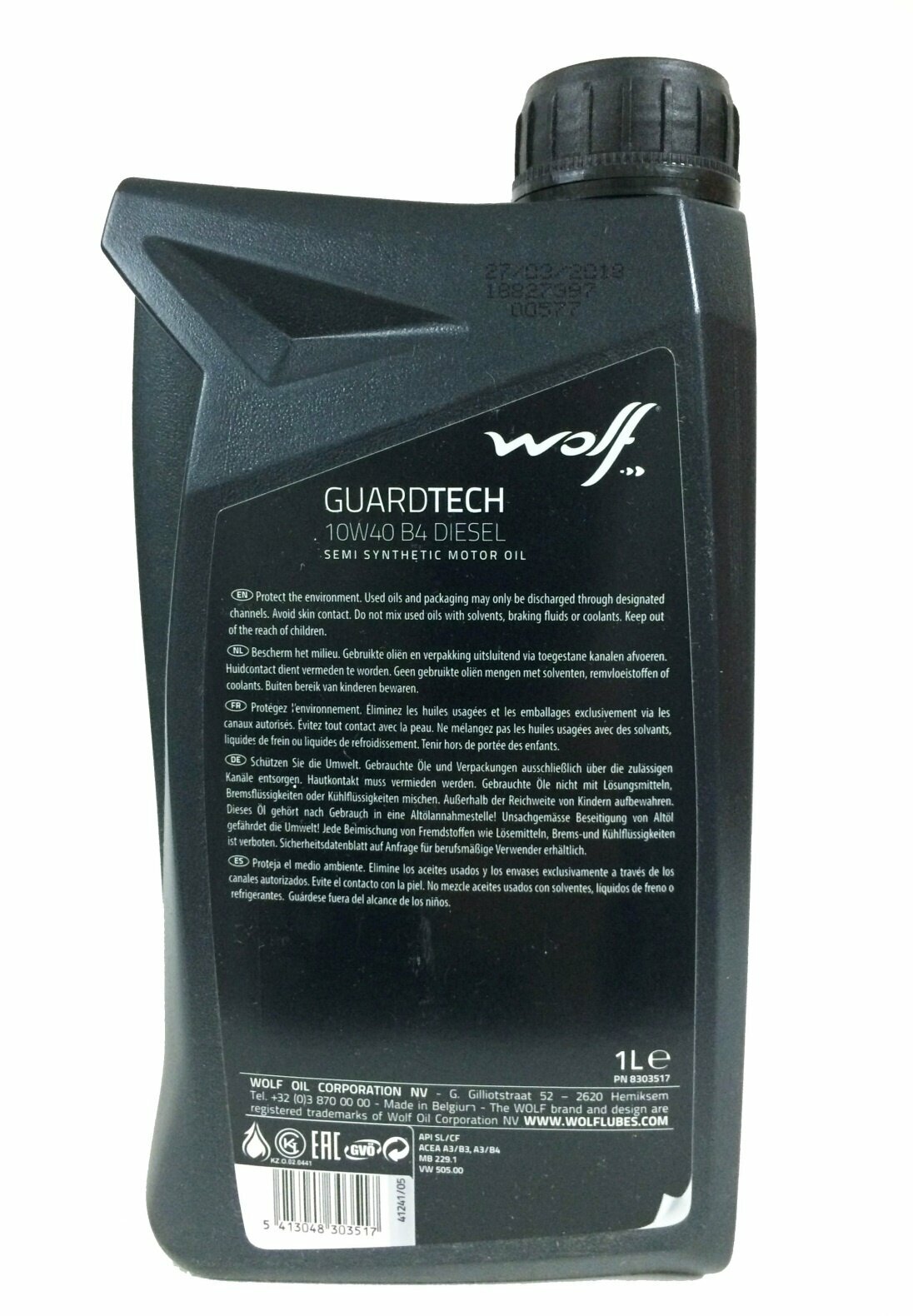 Масло моторное WOLF GUARDTECH 10W40 B4 DIESEL 1L 8303517 информация: