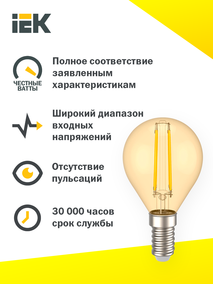 Отзывы на Лампа LED G45 золото 5Вт 230В 2700К E14 серия 360°, IEK LLF-G45-5-230-30-E14-CLG (10 шт.)
