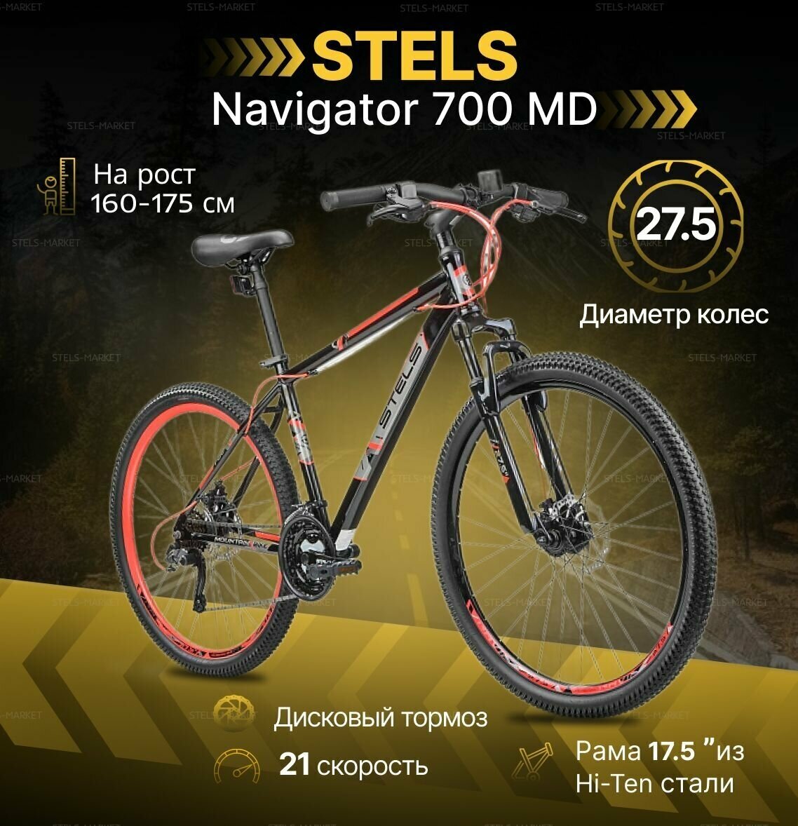 Велосипед "STELS Navigator-700 MD 27,5" -21" -21г. F020 (черный-красный)