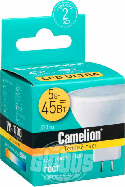 Лампа светодиодная CAMELION LED5-MR16/830/GU5.3 5 Вт, белый информация: