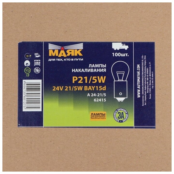 Лампа автомобильная Маяк, 24 В, P21/5W, BAY15d(100 шт.) информация: