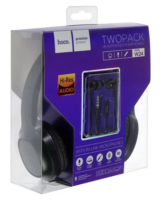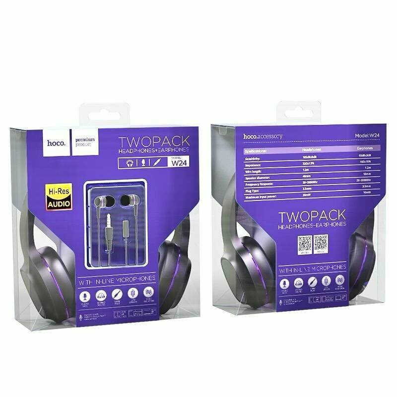 Комплект наушников Hoco W24, проводные, накладные + вакуумные, проводные, фиолетовые