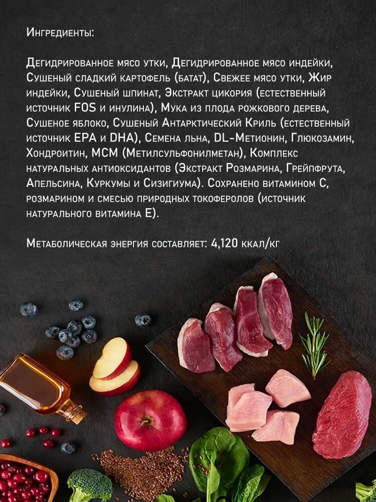 | Состав | дегидрированное мясо индейки, дегидрированное мясо ягненка, дегидрированное мясо утки, дегидрированное мясо кролика, цельный бурый рис, свежее мясо индейки, жир индейки, люцерна, свежее масло лосося, сушеный цикорий, (натуральный источник пребиотиков: FOS и инулина), сушеный антарктический криль (натуральный источник EPA и DHA), сушеные яблоки, мука из плода рожкового дерева, пивные дрожжи (натуральный источник MOS), Юкка Шидигера, глюкозамин, хондроитин, МСМ (метилсульфонилметан), комплекс натуральных антиоксидантов (экстракт розмарина, грейпфрута, апельсина, куркумы и сизигиума), живые пробиотики (Enterococcus faecium) |