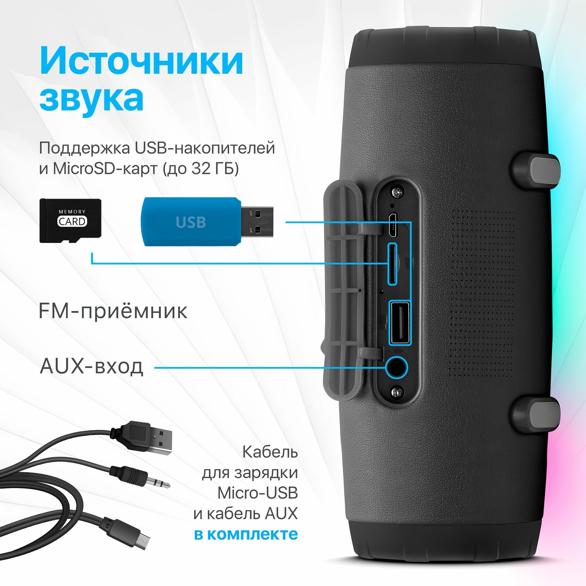 | Особенности | поддержка microSD / световые эффекты / FM-радио / Встроенный MP3-плеер. Используйте как источник звука USB-флеш-накопитель или карту памяти micro SD. |