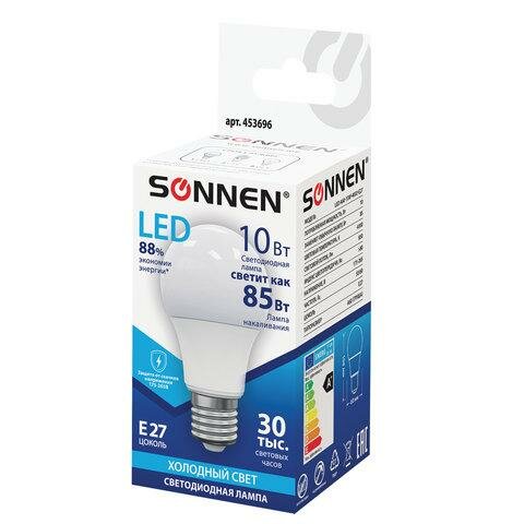Лампа светодиодная SONNEN, 10 (85) Вт, цоколь Е27, грушевидная, нейтральный белый свет, 30000 ч, LED A60-10W-4000-E27, 453696, 453696 298 ₽