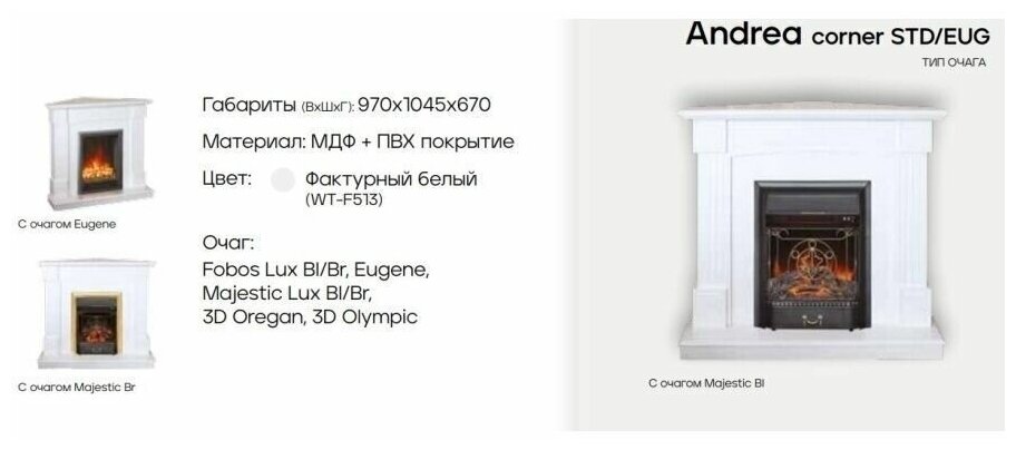 Угловой электрокамин RealFlame Andrea с очагом Majestic Lux Black Фактурный белый информация: