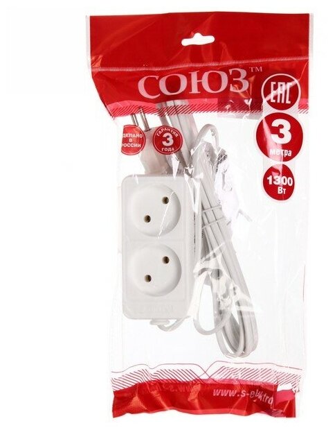 Удлинитель 2х3м без заземл. 6А IP20 ШВВП 1.3кВт Союз 481S-0203 информация: