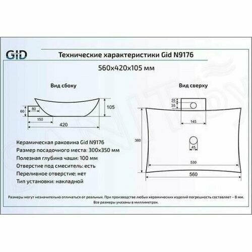 Накладная раковина 56x42x10.5 см, Gid, N9176