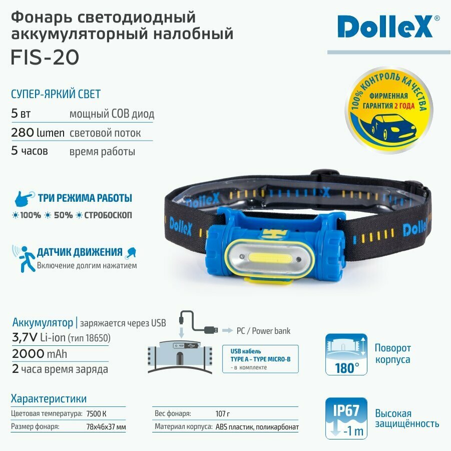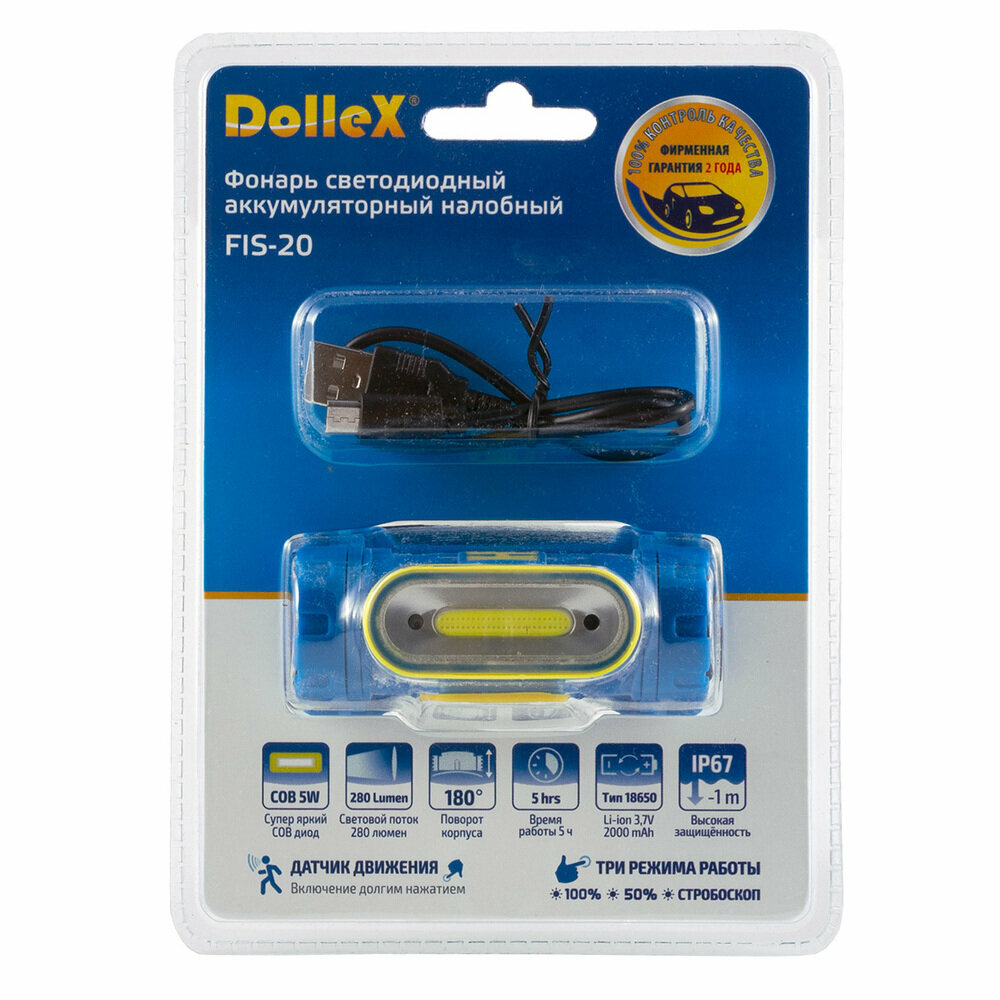 DOLLEX FIS-20 Фонарь DOLLEX налобный аккум Li-ion 3.7V 2000mA COB 5W датчик движения стробоскоп 1 966 ₽