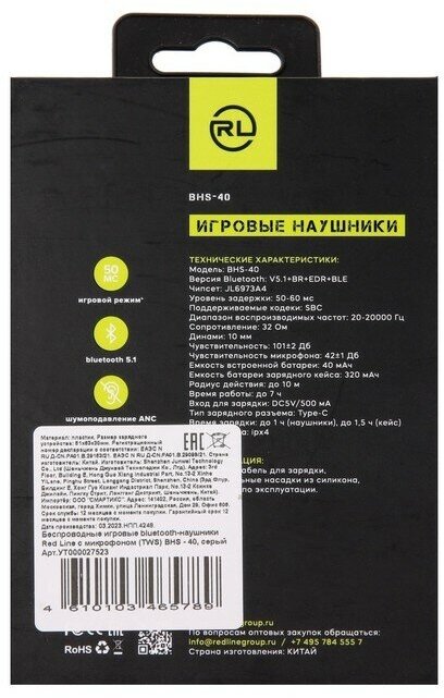 Red Line Наушники беспроводные Red Line BHS-40, TWS, BT 5.0, Type-C, 320 мАч, 101 дБ, серые информация: