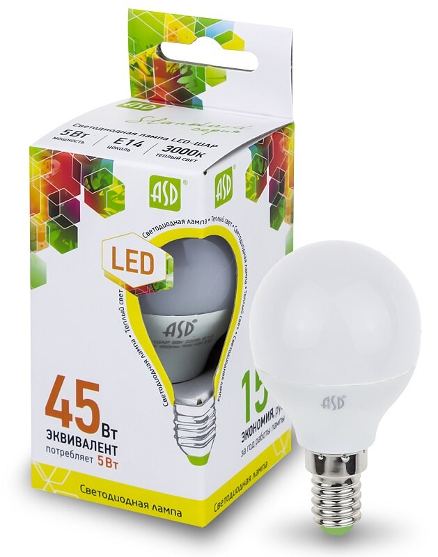 Отзывы на Лампа светодиодная ASD LED-ШАР-STD 3000K, E14, G45, 5 Вт, 3000 К