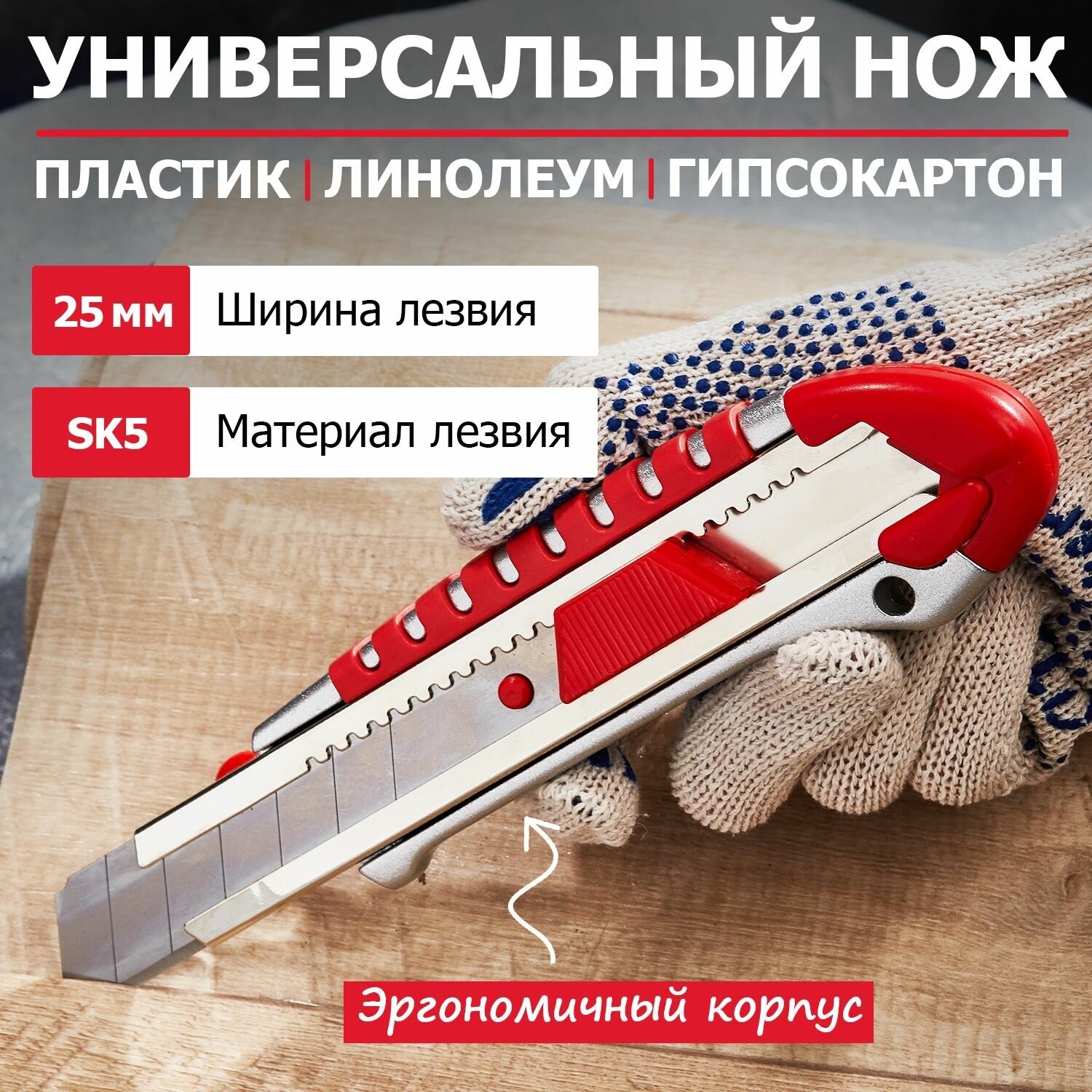 Нож с сегментированным лезвием 25мм металлический обрезиненный корпус с дополнительным замком на лезвии 12-4918, REXANT 124918 (1 шт.)