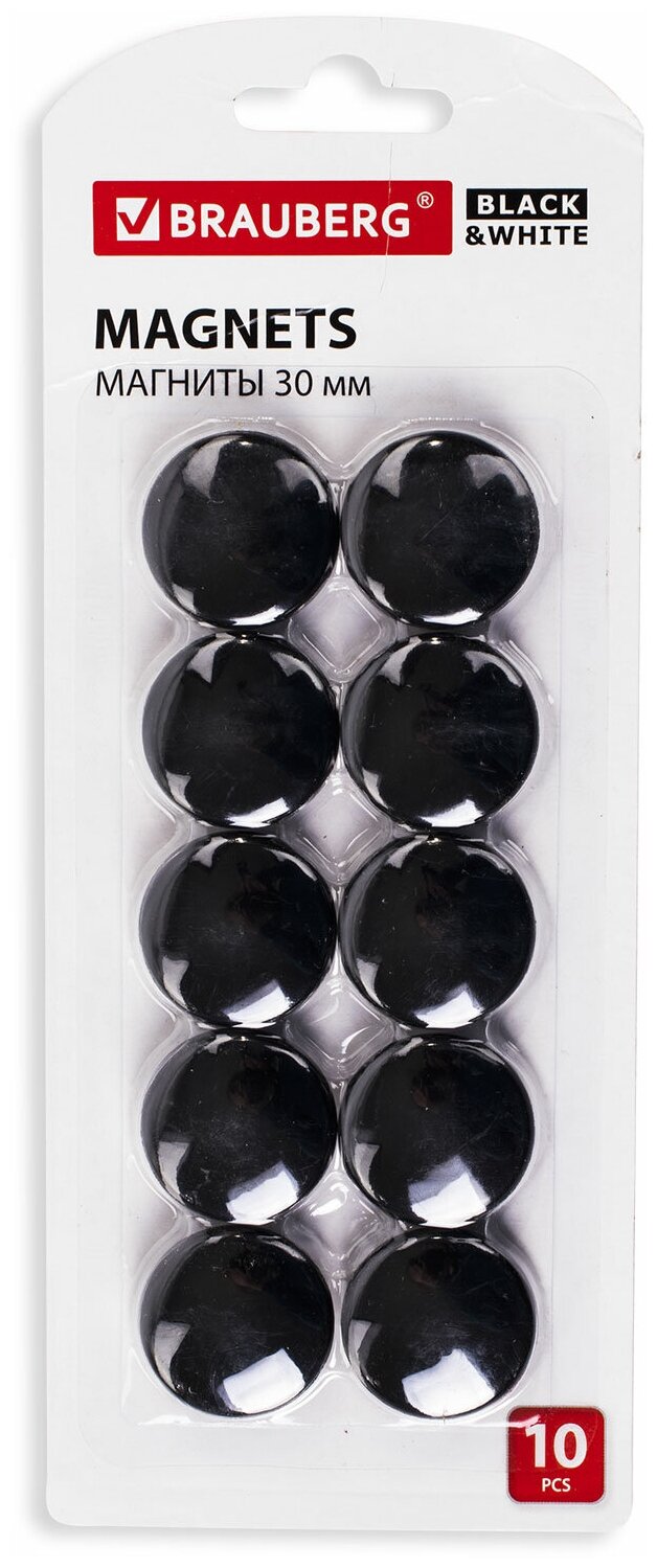 Магниты BRAUBERG "BLACK&WHITE" усиленные 30 мм, набор 10 шт., черные, 237466 (237466)