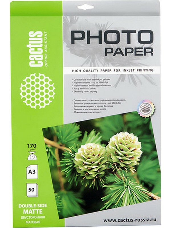 Фотобумага для струйной печати А3, 50 листов Cactus, 170 г/м2, двусторонняя, матовая