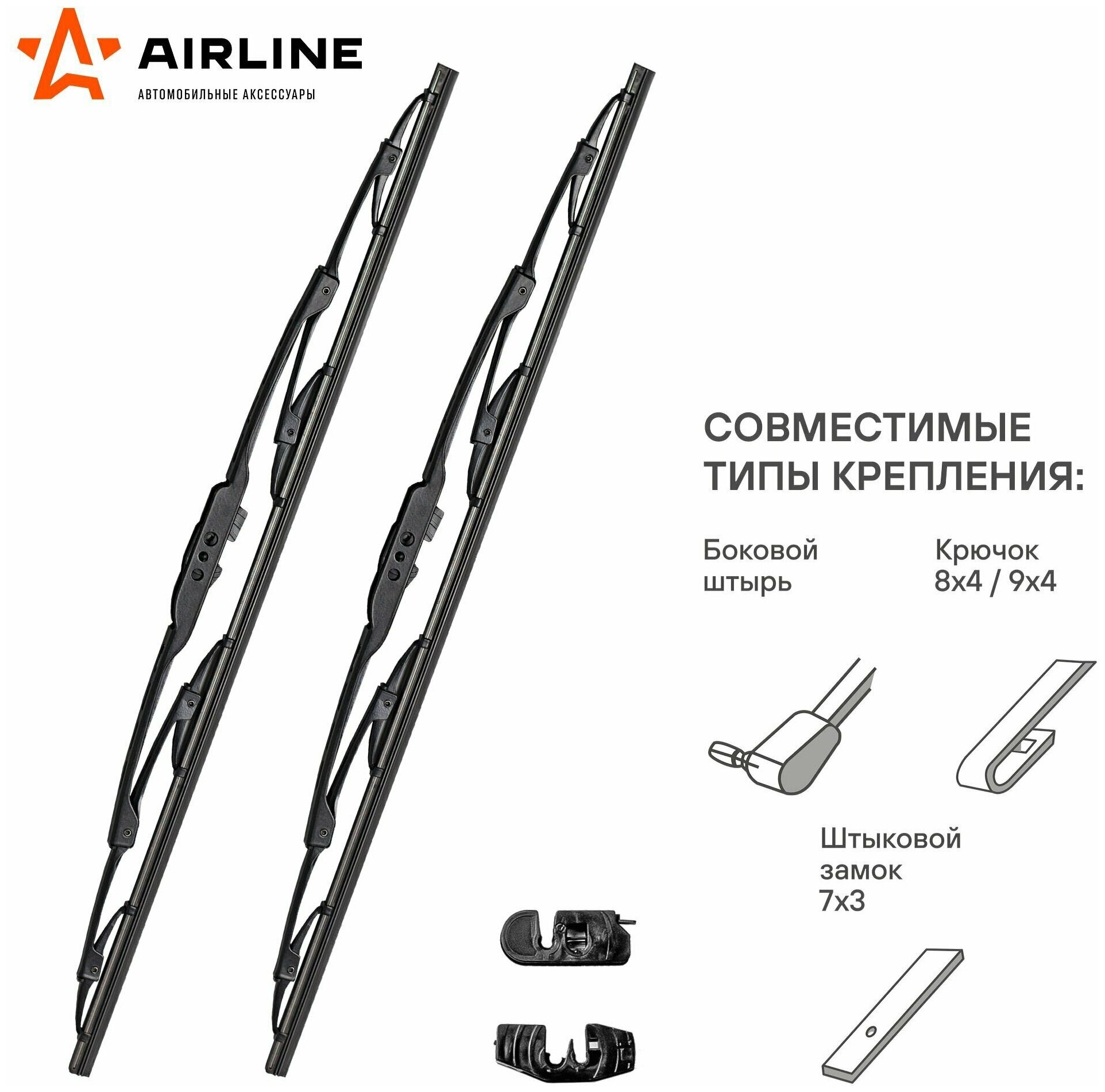 Комплект щеток стеклоочистителя каркасных AIRLINE AWBK330K, 330/330 мм, 2 шт. + 2 адаптера для а/м Lada (ВАЗ), UAZ