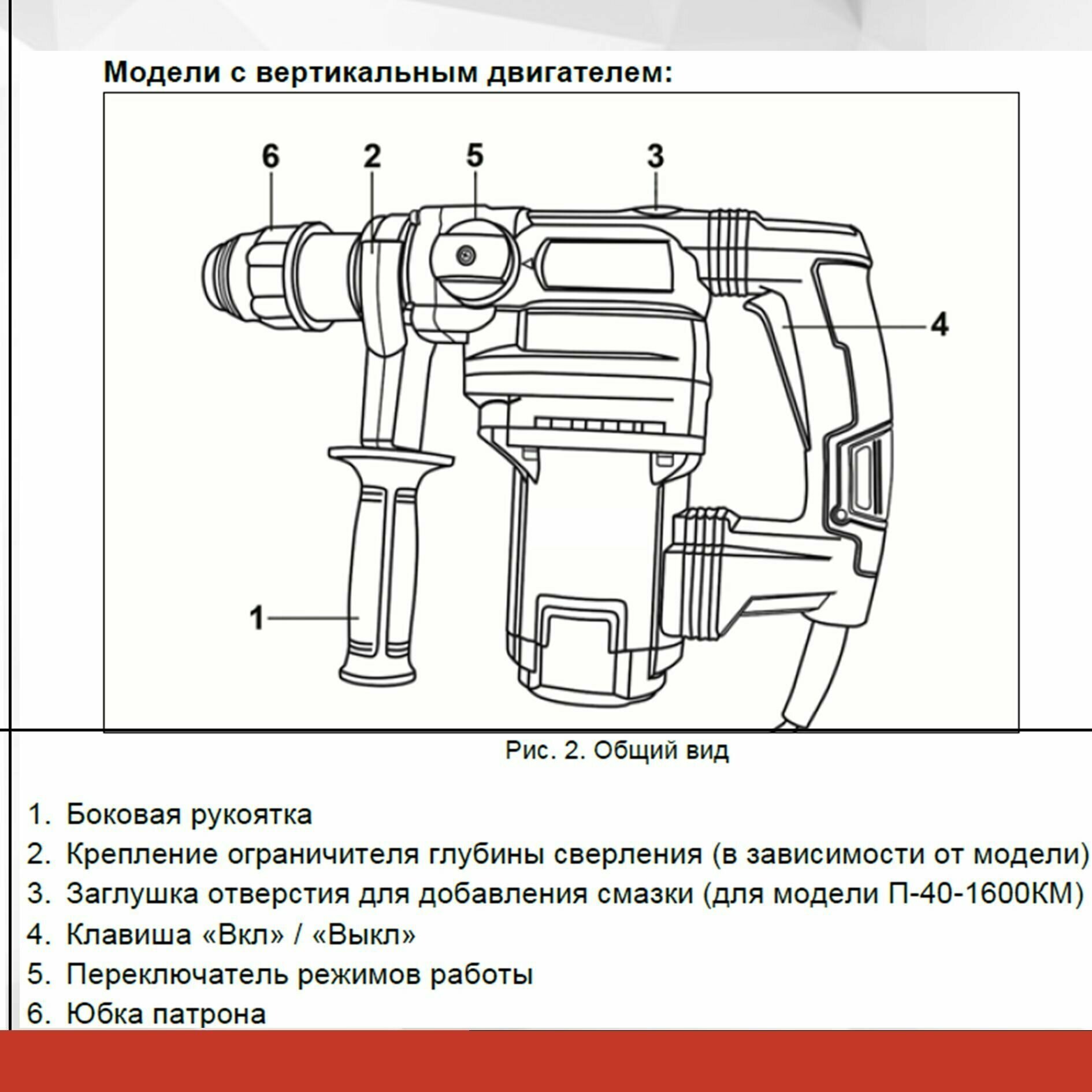 | Комплектация | Боковая рукоятка 1шт. Бур 1шт. Долото 1шт. Кейс пластмассовый 1шт. Ключ для пластиковой заглушки 1шт. Паспорт 1шт. Перфоратор 1шт. Смазка ударного механизма 1шт. |