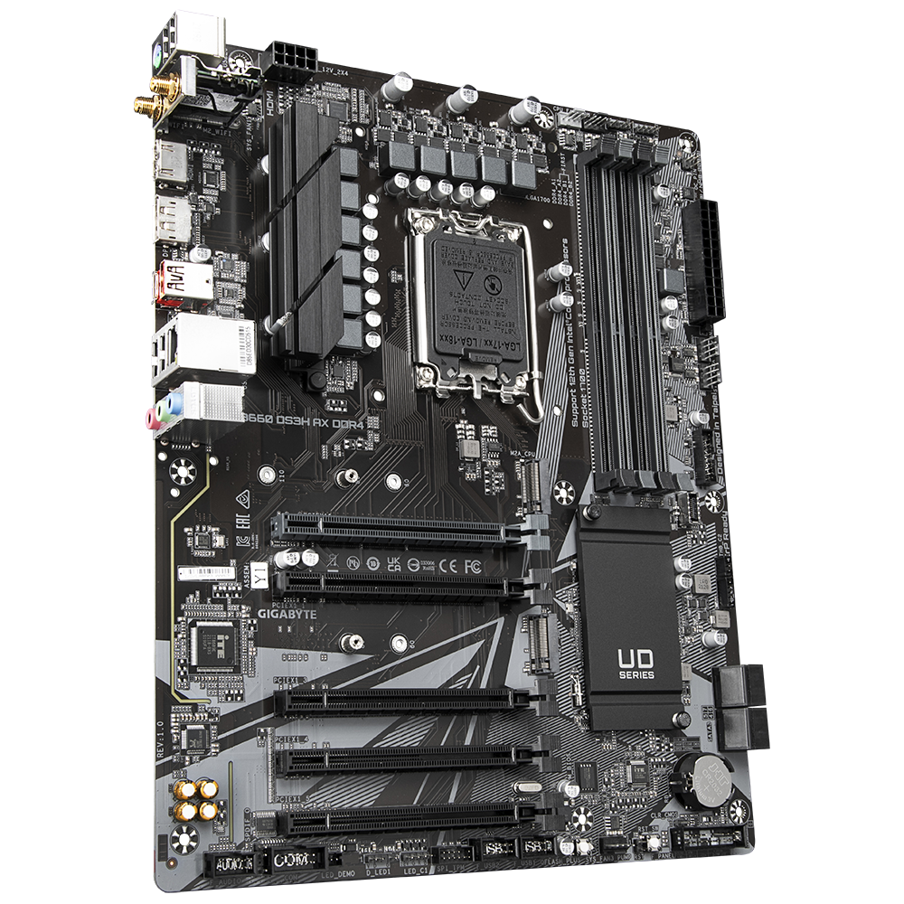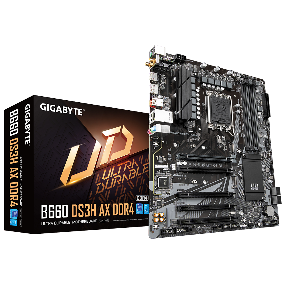 Материнская плата GIGABYTE B660 DS3H AX DDR4, Socket 1700, Intel®B660, 4xDDR4-3200, HDMI+DP, 5xPCI-Ex16, 4xSATA3(RAID 0/1/5/10), 2xM.2, 8Ch Audio, GLan, WiFi, (4+4)xUSB2.0, (1+2)xUSB3.2, (1+1)xUSB3.2 Type-C™, 1xPS/2, ATX, RTL (833381)