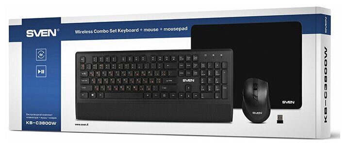 SVEN KB-C3800W Набор беспроводные клавиатура, мышь + коврик чёрные (USB, 104 кл, 6 кнопок, 1600 dpi, 300 x 230)